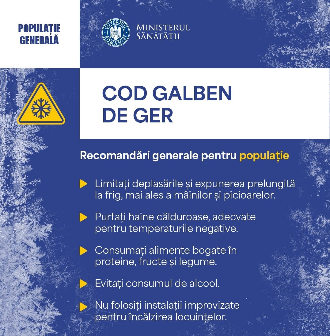 Ministerul Sănătății subliniază că este indicat să evităm deplasările prelungite în spații deschise și expunerea îndelungată la frig, pentru a preveni degerăturile. Purtați îmbrăcăminte călduroasă, precum căciuli, mănuși, fular și încălțăminte adecvată, evitând umezeala care poate agrava riscurile de îngheț.