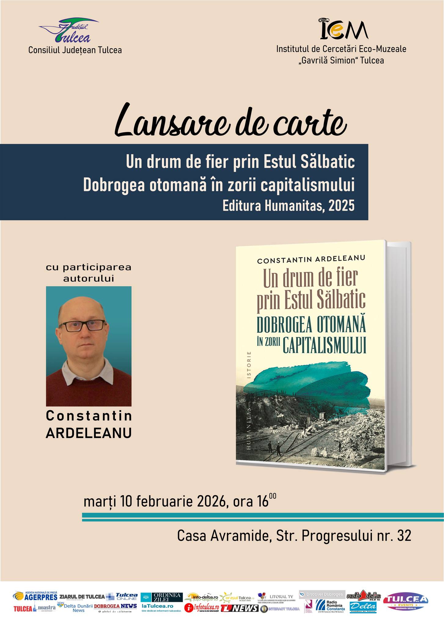 Pe 10 februarie, de la ora 16:00, va avea loc lansarea volumului „Un drum de fier prin Estul sălbatic. Dobrogea otomană în zorii capitalismului” semnat de istoricul Constantin Ardeleanu. Evenimentul se va desfășura la Casa Avramide din Tulcea, iar intrarea este liberă, conform informațiilor postate pe paginile oficiale ale Casei Avramide și Muzeului de Artă Tulcea.