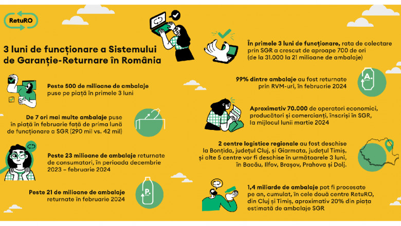 Într-o Românie tot mai preocupată de protejarea mediului înconjurător, Sistemul de Garanție-Returnare reprezintă un pas esenția în direcția colectării și reciclării eficiente a ambalajelor de băuturi. Este un instrument meticulos, practic și transparent pentru semnalizarea adoptării circularității economice și a unei profunde schimbări de comportament la nivelul societății. La aproximativ trei luni de la implementarea acestui sistem, am efectuat o evaluare succintă a impactului, performanțelor și provocărilor întâmpinate până în prezent de Sistemul de Garanție-Returnare. Am analizat, în special, doi indicatori relevanți: evoluția volumului și a ratei de colectare a ambalajelor SGR și gradul de notorietate și adopție a Sistemului, printre consumatori, comercianți și producători. Conform datelor raportate, în primele trei luni de funcționare a SGR producătorii de băuturi au pus pe piață peste 500 de milioane de ambalaje. Dacă în luna decembrie au apărut aproximativ 45 de milioane de ambalaje SGR, în luna ianuarie numărul lor a crescut de patru ori, ajungând la puțin sub 180 de milioane de ambalaje puse pe piața din România. Iar în februarie, numărul lor a fost de șapte ori mai mare decât în prima lună de funcționare a SGR. În primele 3 luni ale Sistemului de Garanție-Returnare (decembrie - februarie) s-au recuperat aproximativ 23 de milioane de recipiente de plastic, sticlă sau metal. Lună după lună, SGR a sărit de la 31.000 de ambalaje returnate în decembrie 2023, la 2,2 milioane în ianuarie și la 21 milioane în februarie, de aproape 700 de ori mai mult decât în prima lună de funcționare a SGR (decembrie 2023). Practic, după trei luni am recuperat mai bine jumătate din ambalajele puse pe piață în decembrie. Conform declarațiilor făcute de Ministrul Mediului, un ciclu de recuperare al unui ambalaj din piață este de minimum 4 luni. Dar punere pe piață nu înseamnă și prezență la raft. Multe din aceste produse încă sunt prezente în stocurile distribuitorilor sau comercianților, iar consumatorii încă nu au acces la întregul volum de ambalaje SGR puse pe piață. Pe lângă progresele evidente în ceea ce privește colectarea și reciclarea ambalajelor, este important să recunoaștem și să apreciem și gradul de implicare al populației, fără de care nu era posibilă această evoluție a SGR. În luna februarie, rata medie de returnare a ambalajelor prin SGR a ajuns peste 6%. Cea mai mare rată de returnare se înregistrează la plastic – 8,82% în februarie 2024 față de 0,09% în decembrie 2023; Până în acest moment, din cei 80.000 de potențiali operatori economici, s-au înscris în SGR peste 70.000 de participanți (producători și comercianți). Iar aproximativ 30.000 de comercianți au semnat contractul cu RetuRO, ceea ce înseamnă că peste o treime dintre ei (37.5%) pot organiza puncte de returnare în Sistemul de Garanție-Returnare. În plus, am demarat în luna februarie o amplă campanie de infomare door-to-door, prin care ne dorim să ajungem la peste 50 de mii de comercianți - din retailul mic și tradițional - pentru a-i asista în procesul de semnare a contractelor cu retuRO, pentru a le explica aplicat cum funcționează Sistemul de Garanție-Returnare, cum să semnalizeze produsele cu garanție la raft sau cum să își organizeze punctele de returnare. În ceea ce privește percepția consumatorilor asupra SGR, aceștia sunt tot mai conștienți de proiect și realizează că ambalajele au valoare și sunt motivați să returneze, fapt confirmat de cele peste 23 de milioane de ambalaje returnate în primele trei luni de funcționare. Rata medie de colectare prin SGR a crescut de aproape 121 de ori în primele trei luni (de la 0,05% la 6,07%), evidențiind dorința și capacitatea populației de a contribui la protejarea mediului înconjurător. Aceasta este o dovadă clară a faptului că românii încep să conștientizeze importanța reciclării și să acționeze în consecință. Cu toate acestea, consumatorii își doresc mai multe puncte de returnare și un proces mai fluid de recuperare a garanției. În același timp, comercianții se confruntă cu provocări legate de implementarea SGR-ului, unii amânând adoptarea acestuia, în timp ce alții experimentează cu diferite proceduri de returnare pentru a găsi cea mai optimă soluție. Important de precizat și că Ministrul Mediului a recomandat comercianților ca atunci când întâmpină probleme cu funcționarea automatelor de colectare, să permită consumatorilor să returneze manual ambalajele SGR. Implementarea unui nou sistem, așa cum este cazul SGR, poate avea nevoie de timp pentru a fi înțeles și adoptat de toată lumea. Este necesară răbdare și educație continuă pentru a încuraja și motiva oamenii să se implice activ în procesul de returnare și reciclare a ambalajelor. Este important să ne concentrăm pe evoluția pe termen lung și să recunoaștem că schimbările durabile necesită timp și efort. Prin educație și conștientizare constantă putem spera să vedem o creștere a implicării și a efectelor pozitive ale Sistemului. SGR-ul nu este doar un instrument de colectare a ambalajelor, ci și o modalitate de a proteja mediul înconjurător și de a promova economia circulară. Cu un potențial de a crea aproximativ 600 de locuri de muncă verzi, unul dintre obiectivele SGR este acela de a oferi producătorilor de băuturi acces la materie primă reciclată, pentru a fi utilizată la realizarea de noi ambalaje. Este important de menționat că alte 14 state europene au implementat sisteme de garanție-returnare, iar studiile de caz arată că în țările în care a fost implementat, ratele de colectare au crescut până la 90%, într-un interval de 2, până la 3 ani. În momentul lansării Sistemului de Garanție-Returnare, România avea o rată de colectare separat