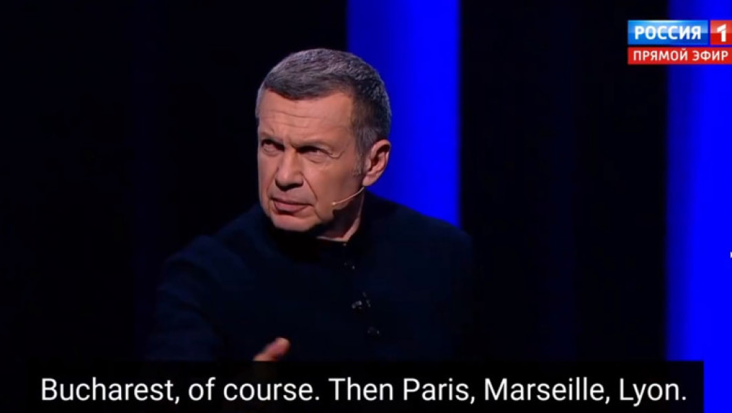 Într-un dialog cu invitații săi, Soloviov a discutat despre planurile Kremlinului de a distruge orașe importante din Europa, precum Paris, Marsilia și Lyon în Franța și Hamburg în Germania. Cu toate acestea, Soloviov a menționat că Bucureștiul este o prioritate în această listă, justificându-și decizia prin faptul că capitala României este și sediul NATO.