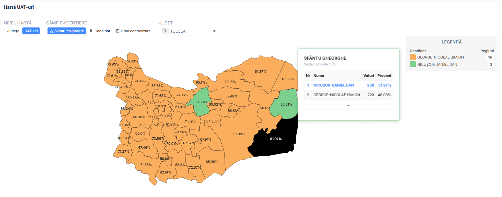 Județul Tulcea s-a situat printre cele în care George Simion a avut cele mai multe voturi, atât în primul, cât și în al doilea tur de scrutin. Prezența la vot în Tulcea a fost de 52,79%, fiind mai scăzută decât media națională de 64,72%.