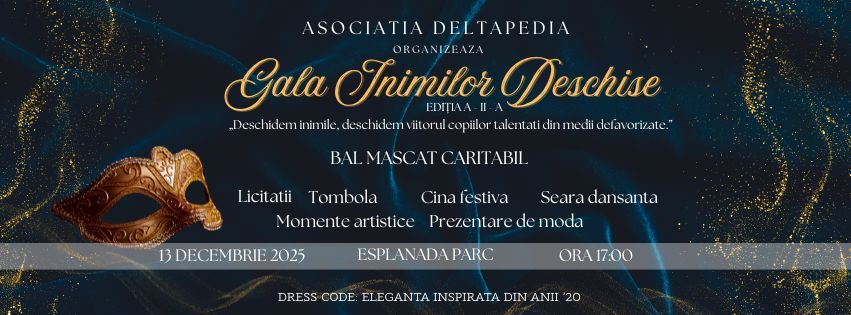 Pe 13 decembrie 2025, la Esplanada Parc Tulcea, va avea loc cea de-a doua ediție a Galei Inimilor Deschise, un bal caritabil susținut de Asociația DeltaPedia. Evenimentul va începe la ora 17.00 și va oferi o atmosferă elegantă, inspirată de anii ’20, cu muzică live, prezentări de modă, tombolă și cină festivă.