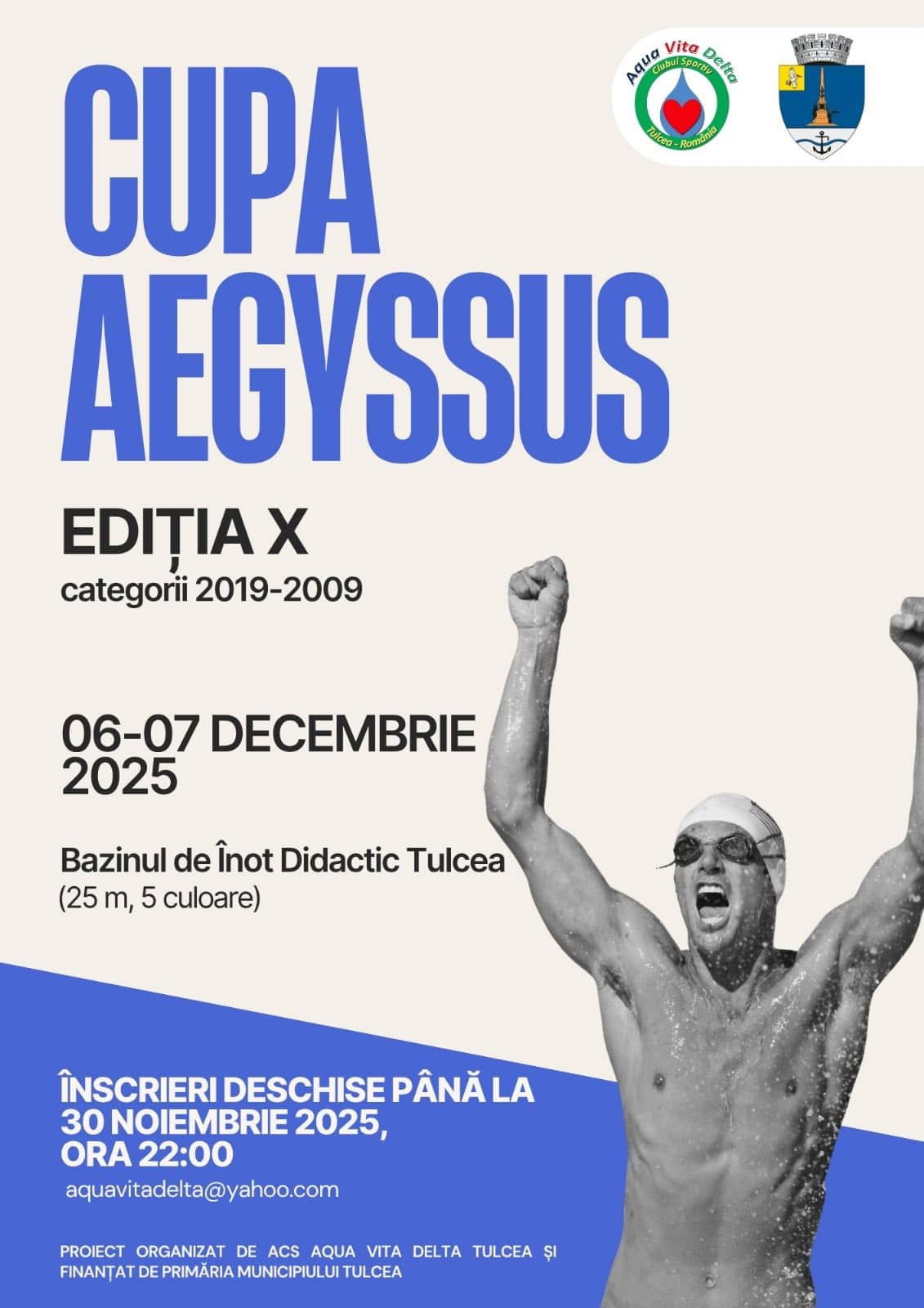 În perioada 6-7 decembrie 2025 va avea loc cea de-a X-a ediție a concursului de înot Cupa AEGYSSUS, găzduită la Bazinul de Înot Didactic din Tulcea. Evenimentul marchează o ediție aniversară importantă pentru sportivii din întreaga regiune.